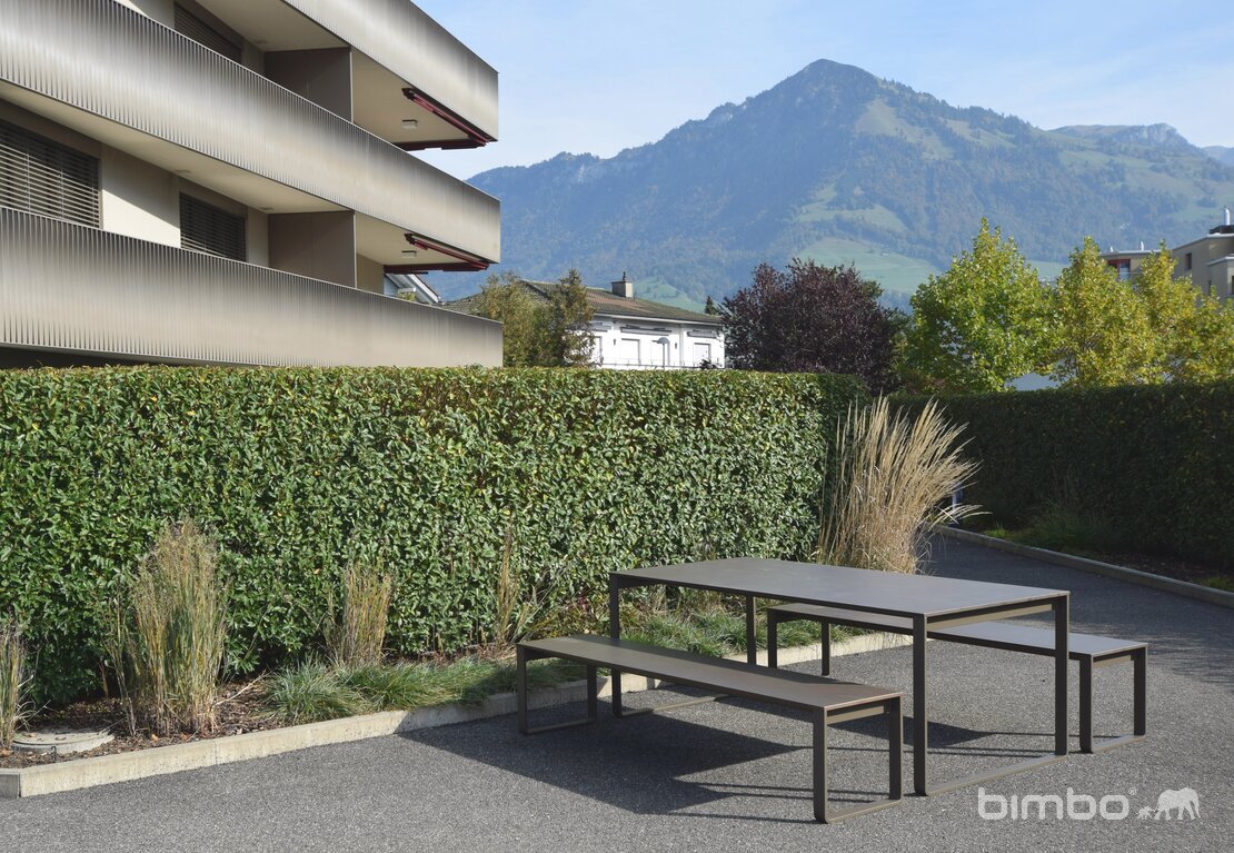 Avec plateau en matière synthétique résistant aux intempéries, anthracite ou selon un nuancier d'environ 100 couleurs différentes. Structure métallique galvanisée et couleur en duplexe gris argenté ou anthracite ou selon RAL/NCS. A visser.